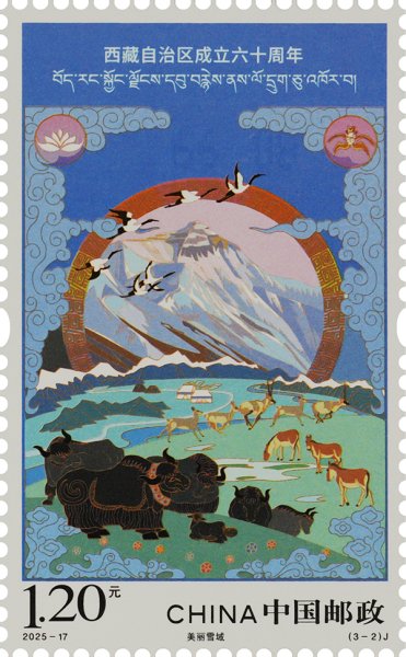 中国邮政定于2025年8月15日发行《西藏自治区成立六十周年》纪念邮票1套3枚,邮票图案名称为:同心筑梦、美丽雪域、幸福高原。全套邮票面值3.60元,计划发行数量为490万套。