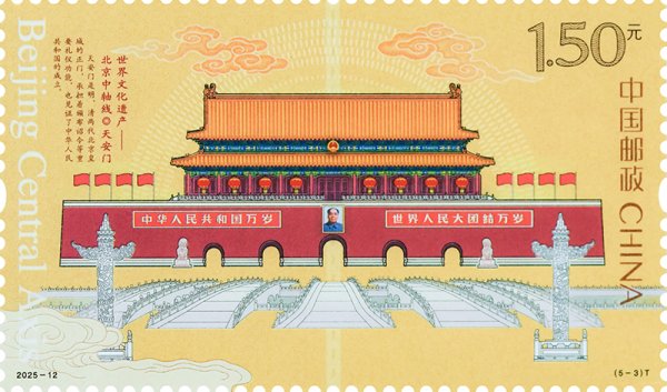 中国邮政定于2025年7月27日发行《世界文化遗产——北京中轴线》特种邮票1套5枚。邮票图案名称为:永定门、正阳门、天安门、故宫·景山、钟鼓楼。全套邮票面值5.50元。邮票计划发行数量为套票570万套,版式二69.3万版。
